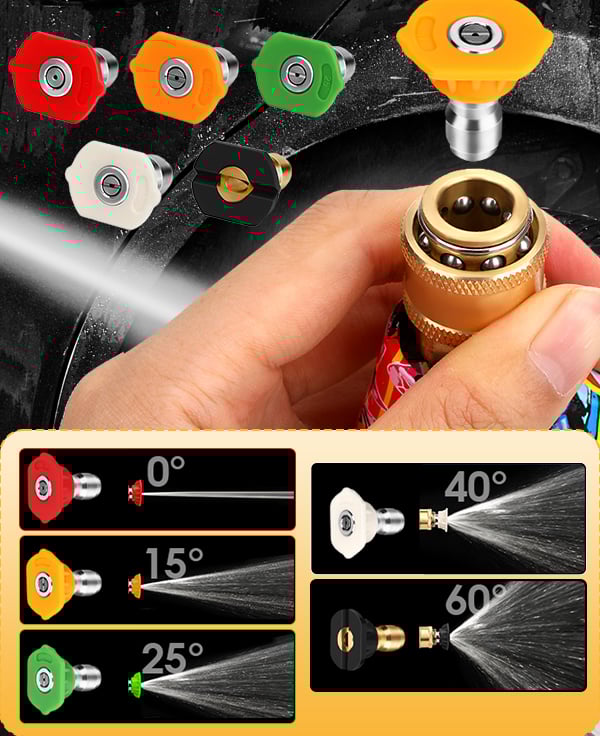 5 Spray Nozzles for Versatile Cleaning: Includes five color-coded spray tips with different angles and pressure types: